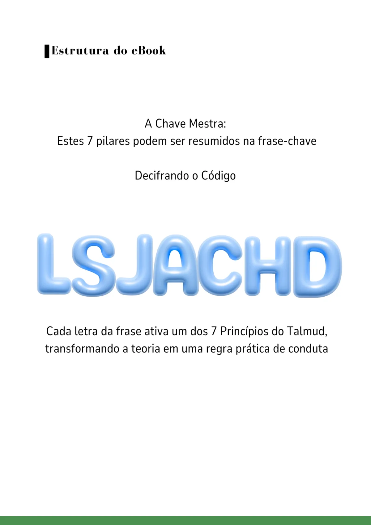 A mnemotecnia L-S-J-A-C-H-D é uma chave mestra criada para tornar os 7 princípios mais acessíveis e memoráveis. No entanto, cada um dos 7 Princípios é um conceito central e amplamente debatido na vasta literatura do Talmud. O e-book fornece o mapa claro para aplicar essa sabedoria milenar.